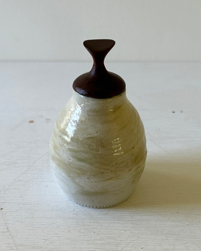陶芸家の森下真吾が創作したオリジナルの器。 木工家の清水泰が器に合わせて創作した蓋。 この組み合わせで、新しい「蓋物」が完成しました。 今回ご紹介するのは、小壺型の蓋物作品です。 コロンとしたフォルムに、素朴な地とイッチン模様、首の黒が特徴の器です。 蓋を開けると、中はビックリの赤色になっています。 落ち着いた表情の神代ケヤキの蓋に、小枝風のツマミを合わせました。 蓋が平なのでお茶杓を乗せることができます。 落ち着きも、可愛らしさもあるような作品です。 さあ、あなたはこの作品に何を入れますか? どのように使いますか? ■素材:器/陶器 蓋/神代ケヤキ ■サイズ:幅約67mm、奥行き約67mm、高さ約70mm ※写真のスケールは高さ100mmです。 《器について》 ・器は多孔質の陶土と多種の釉薬を使い、器体の呼吸を妨げないよう、そして風合いを重視して仕上げております。長時間水を貯めて使用される花器等の作品では、滲み止め剤を施していますが、その効果は完璧ではなく、作品ごとのばらつき(陶土や釉薬の違い)もあるため、水を貯めてから数日後に少しずつ水が滲みてくる場合がありますので、水に弱い場所に置いて使用する際にはご注意ください(受け皿を使うなどの対策をお勧め致します)。 ・使用後の器は、よく乾燥させてください。乾燥が不十分ですと、カビ発生の原因になりますし、陶器の強度にも悪影響が出てきます。 《蓋について》 ・蓋は無垢材を用いて、セラミック系塗料で仕上げております。水分には強いですが完璧ではなく、放置すると染みになる可能性があります。水分が付いたら早めに拭取るようにしてください。 ・食器乾燥機や電子レンジの使用、直射日光に当てての乾燥は、割れや反りの原因になりますので避けてください。 ・蓋には密閉性はありませんので、湿気を嫌うものの保存容器としては不向きです。