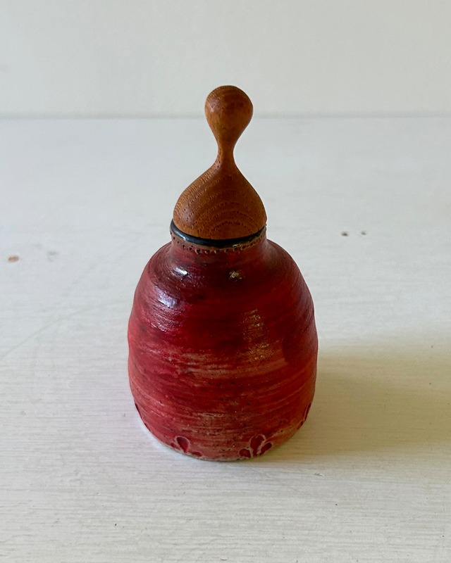陶芸家の森下真吾が創作したオリジナルの器。 木工家の清水泰が器に合わせて創作した蓋。 この組み合わせで、新しい「蓋物」が完成しました。 今回ご紹介するのは、振出型の蓋物作品です。 丸みを帯びたフォルムに、深みのある赤色が特徴の器です。 蓋を開けると、首元が黒くなっています。 ケヤキを使い、丸っこい形にまとめてみました。 可愛らしくも渋くもあるような独特の雰囲気を纏った作品です。 さあ、あなたはこの作品に何を入れますか? どのように使いますか? ■素材:器/陶器 蓋/ケヤキ ■サイズ:幅約48mm、奥行き約48mm、高さ約88mm ※写真のスケールは高さ100mmです。 《器について》 ・器は多孔質の陶土と多種の釉薬を使い、器体の呼吸を妨げないよう、そして風合いを重視して仕上げております。長時間水を貯めて使用される花器等の作品では、滲み止め剤を施していますが、その効果は完璧ではなく、作品ごとのばらつき(陶土や釉薬の違い)もあるため、水を貯めてから数日後に少しずつ水が滲みてくる場合がありますので、水に弱い場所に置いて使用する際にはご注意ください(受け皿を使うなどの対策をお勧め致します)。 ・使用後の器は、よく乾燥させてください。乾燥が不十分ですと、カビ発生の原因になりますし、陶器の強度にも悪影響が出てきます。 《蓋について》 ・蓋は無垢材を用いて、セラミック系塗料で仕上げております。水分には強いですが完璧ではなく、放置すると染みになる可能性があります。水分が付いたら早めに拭取るようにしてください。 ・食器乾燥機や電子レンジの使用、直射日光に当てての乾燥は、割れや反りの原因になりますので避けてください。 ・蓋には密閉性はありませんので、湿気を嫌うものの保存容器としては不向きです。