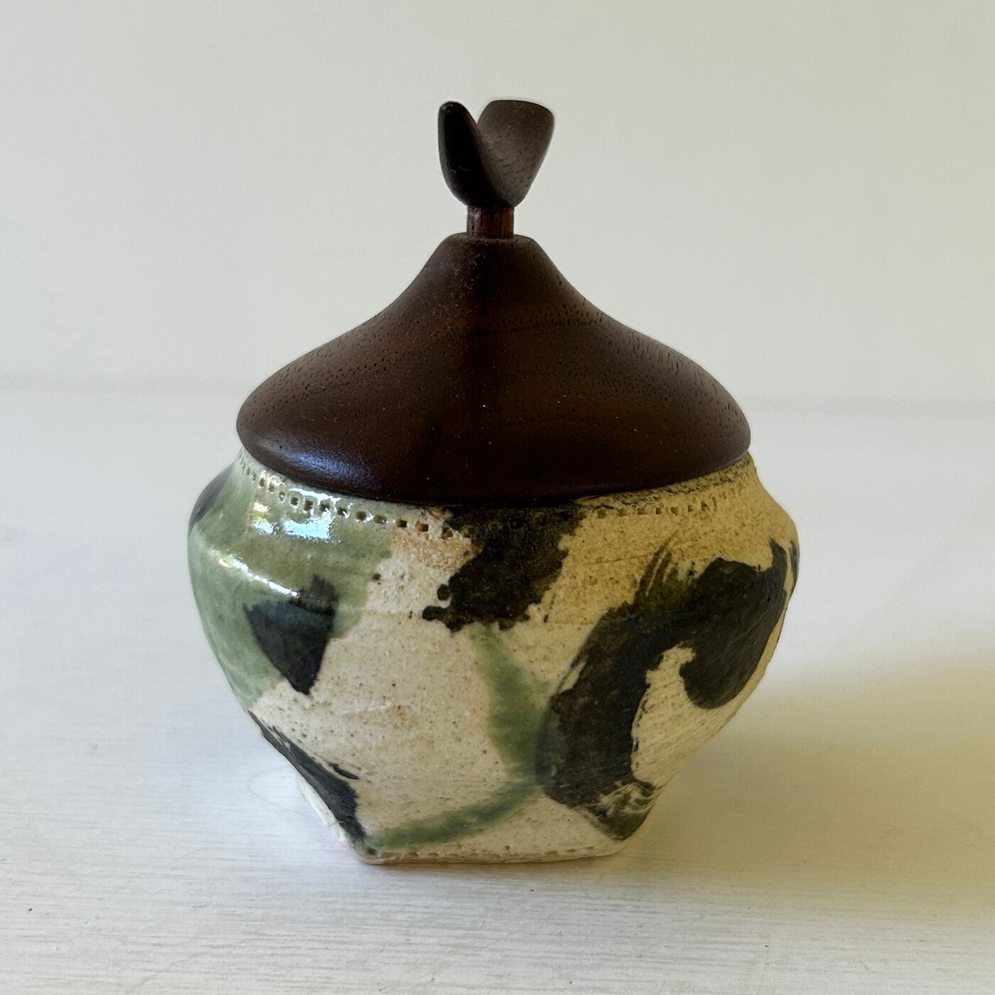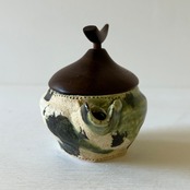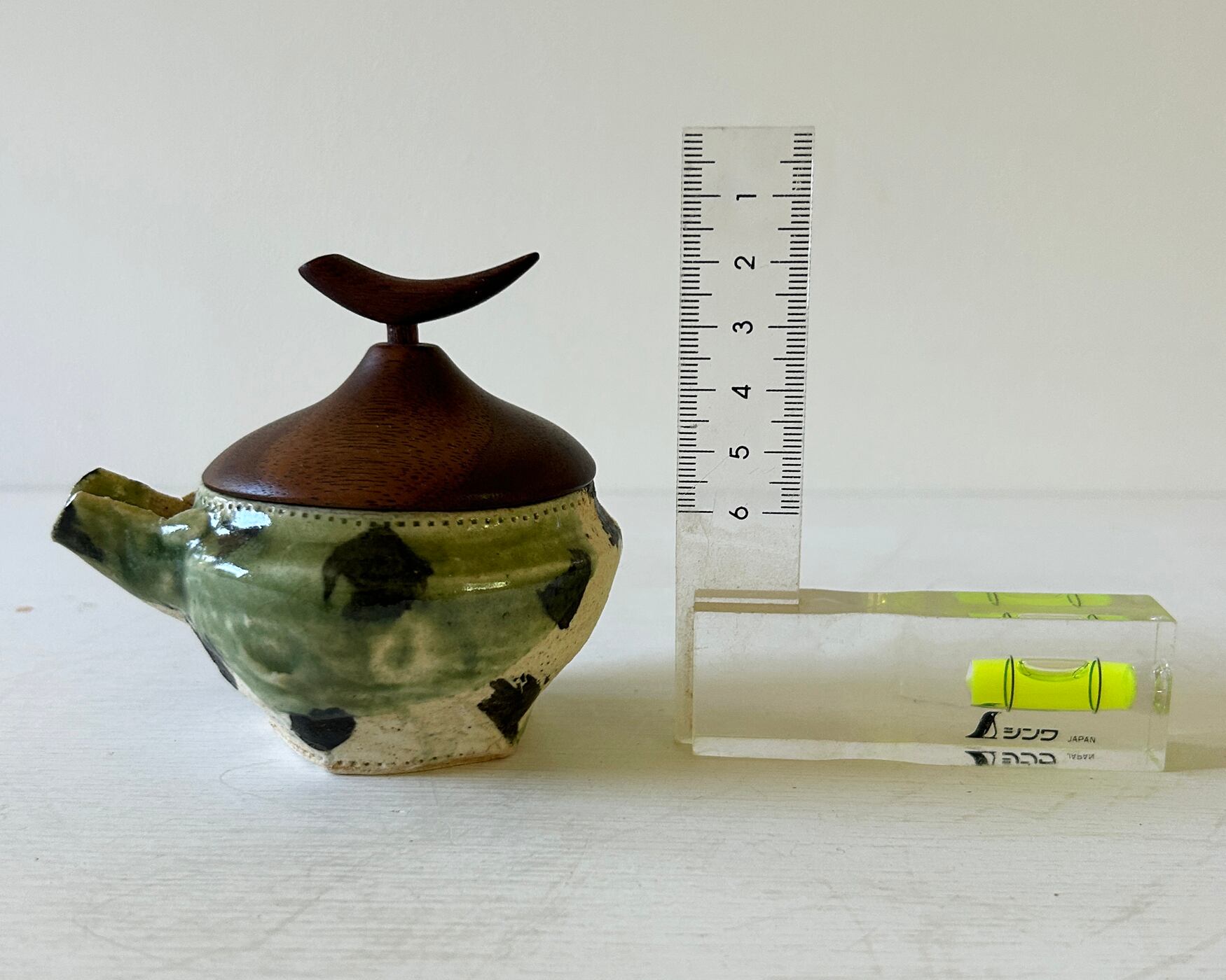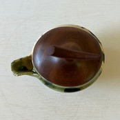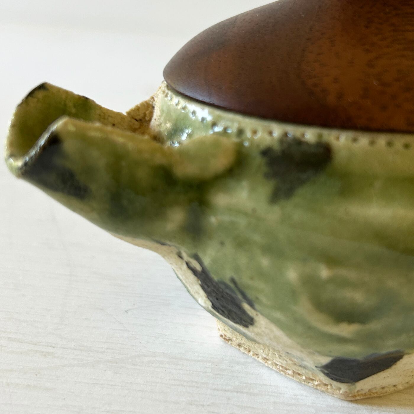 素朴な白地に黒の模様、そこにふわりと被せた緑色が印象に残る器です。