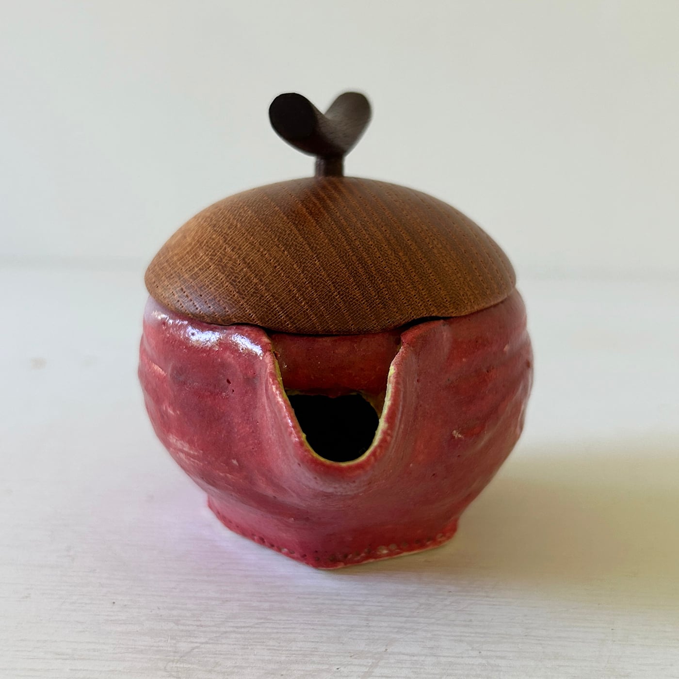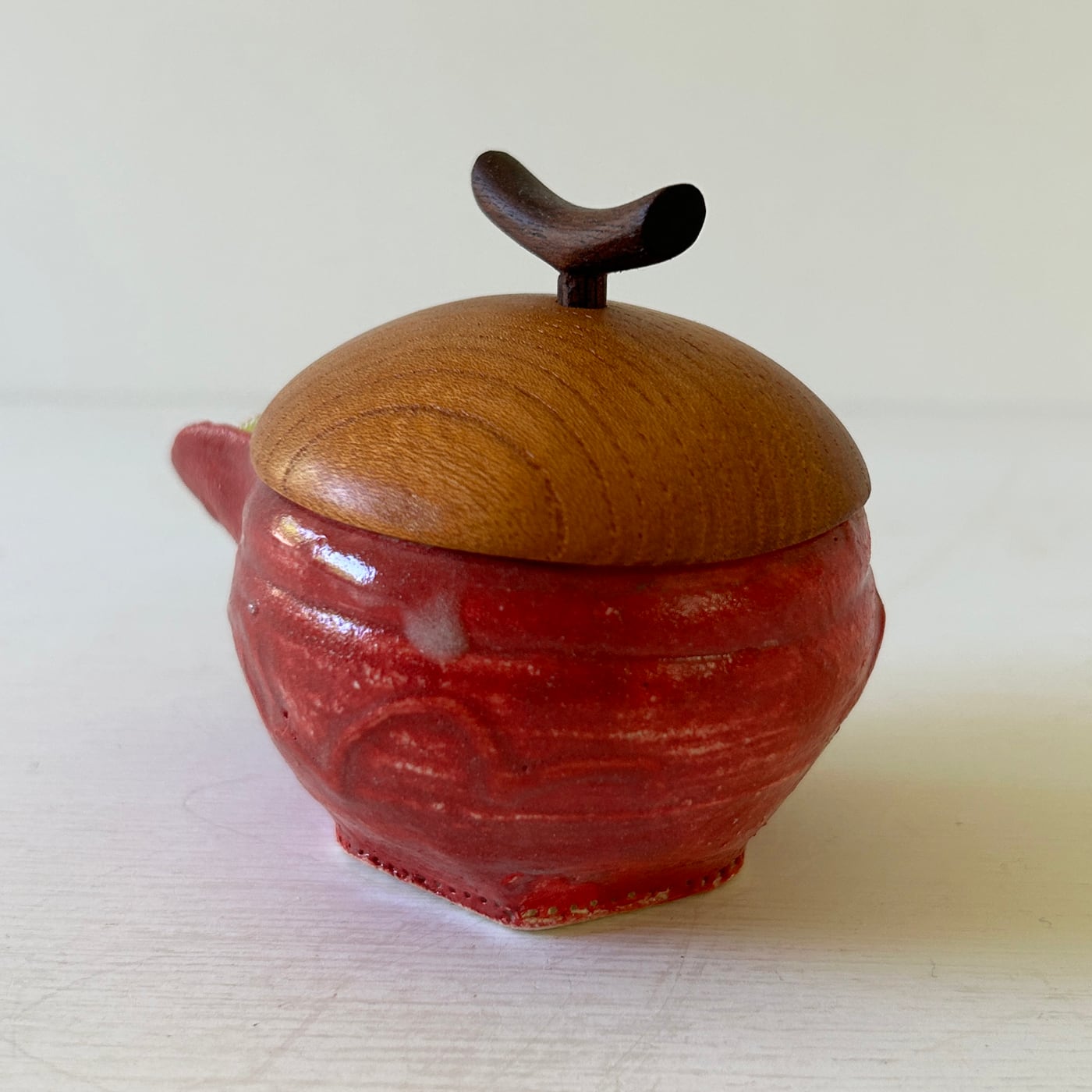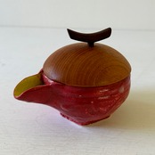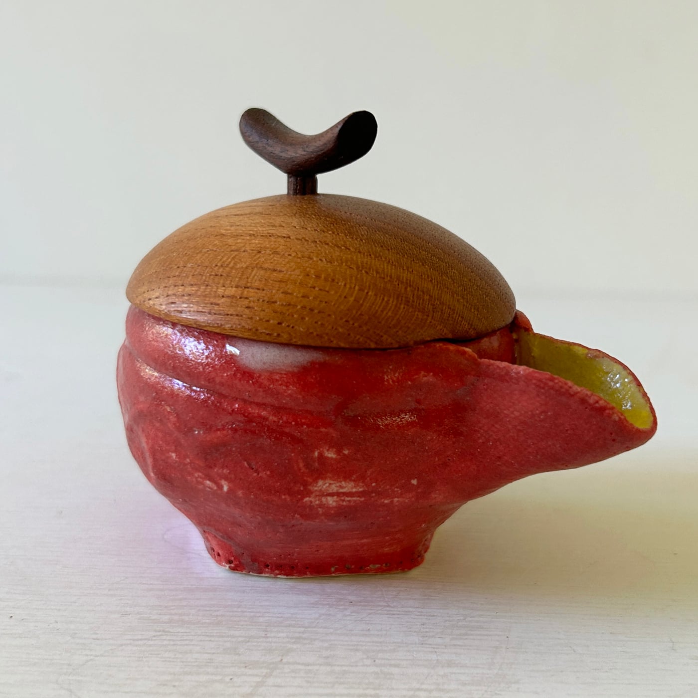 鮮やかな赤に、注ぎ口の内側にちらりと覗く黄色がおしゃれな作品です。