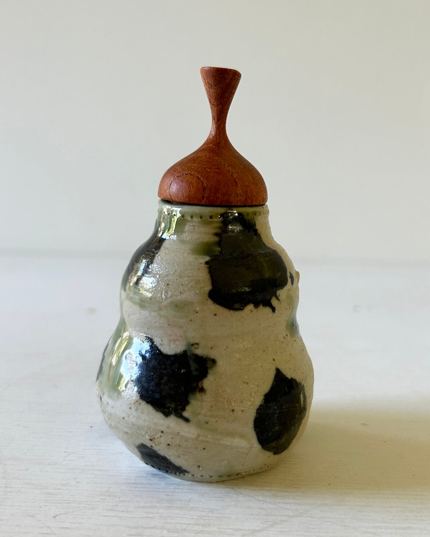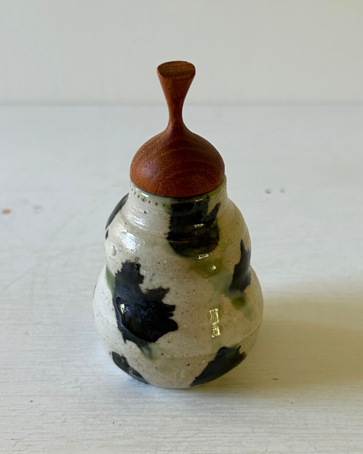 瓢箪のフォルムに、白地に緑のドットを散らした器です。