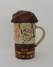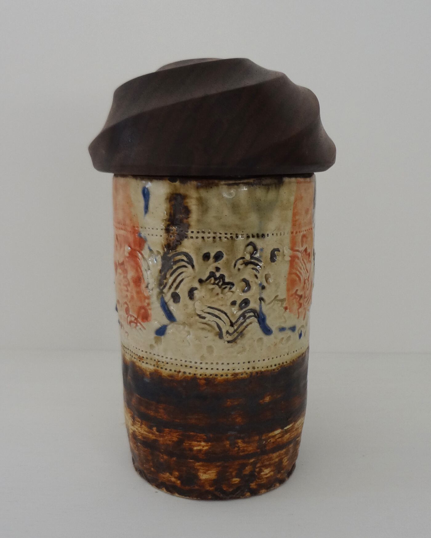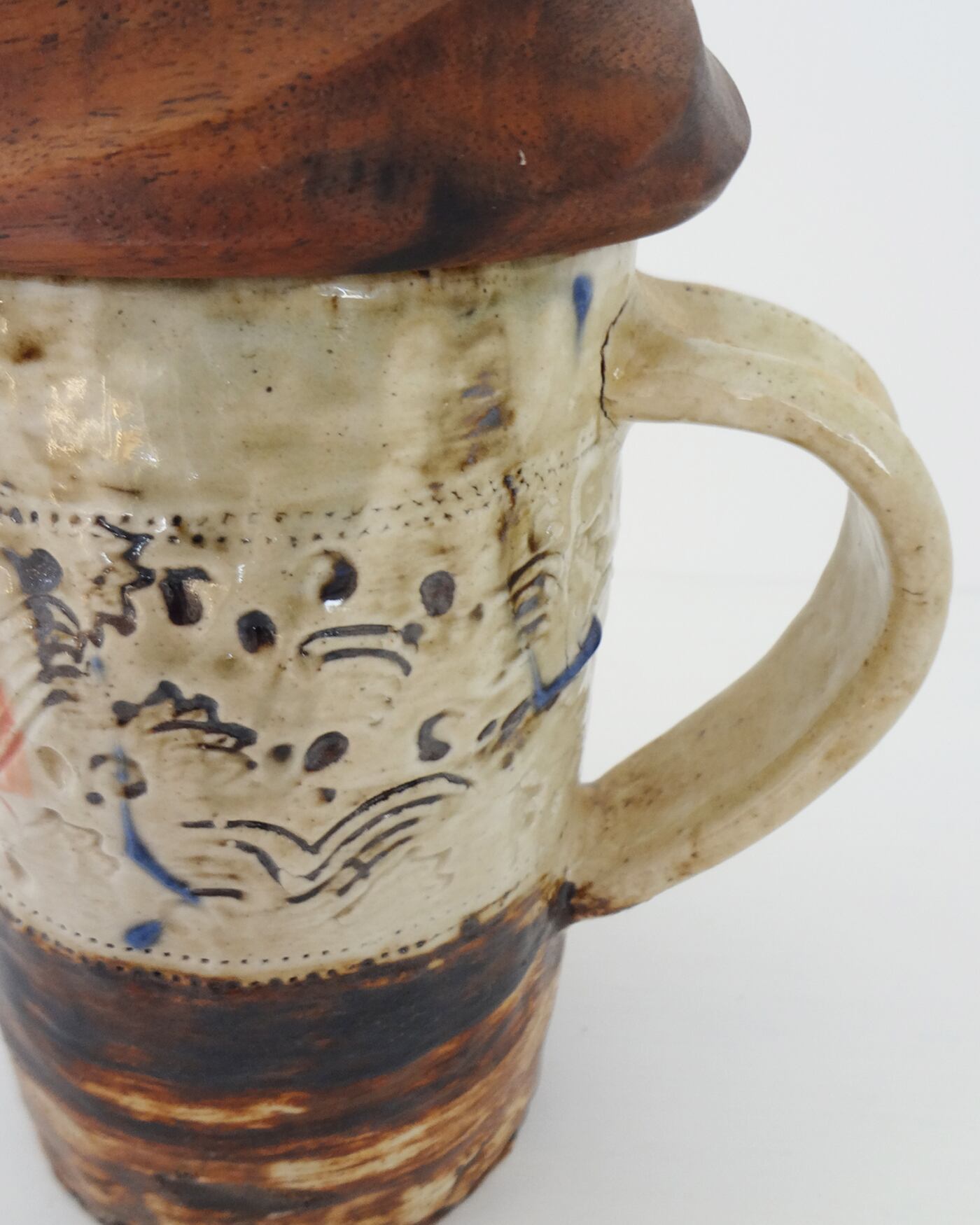 ふわりとして動きのある蓋を被せた縦長の器、取っ手付き。