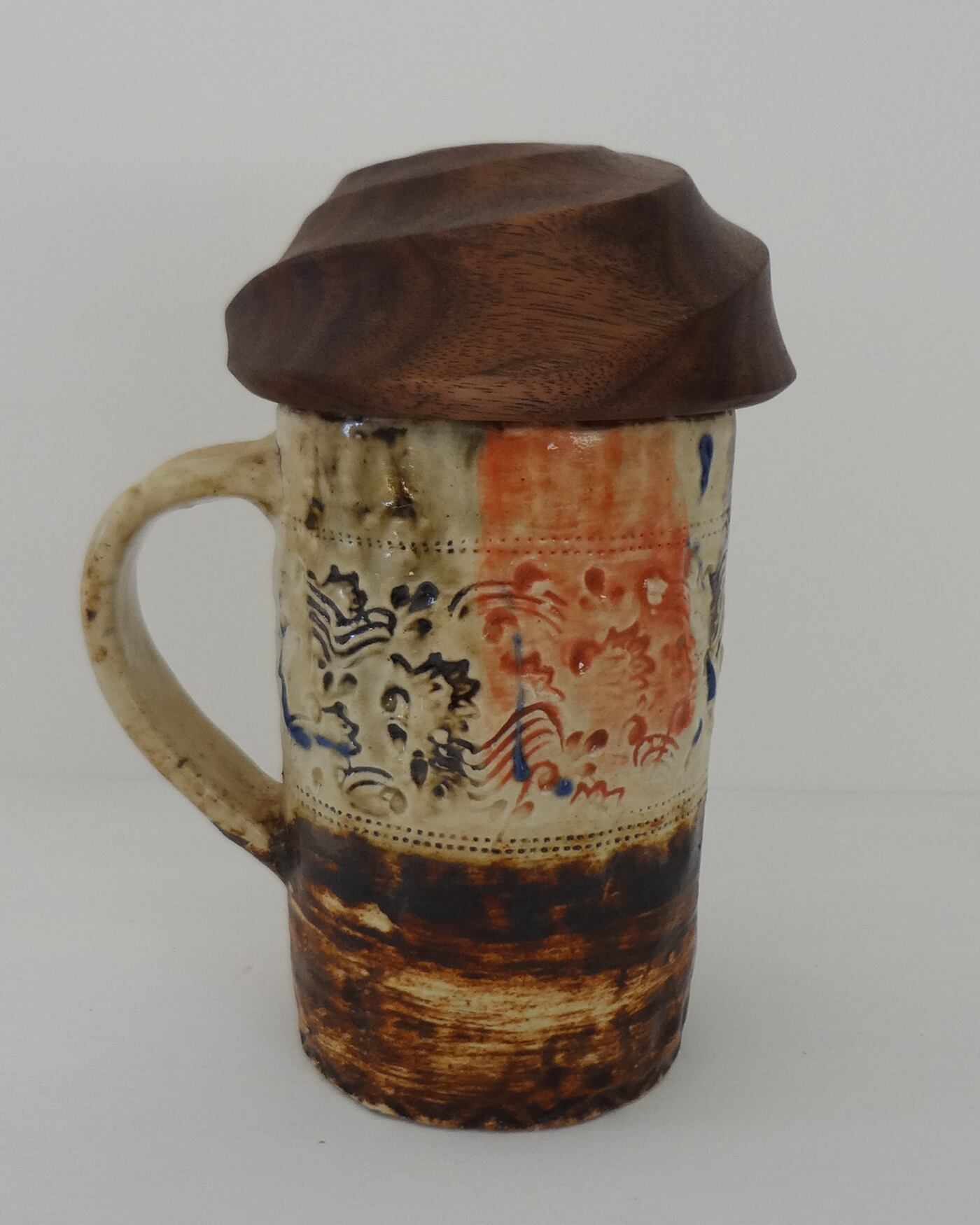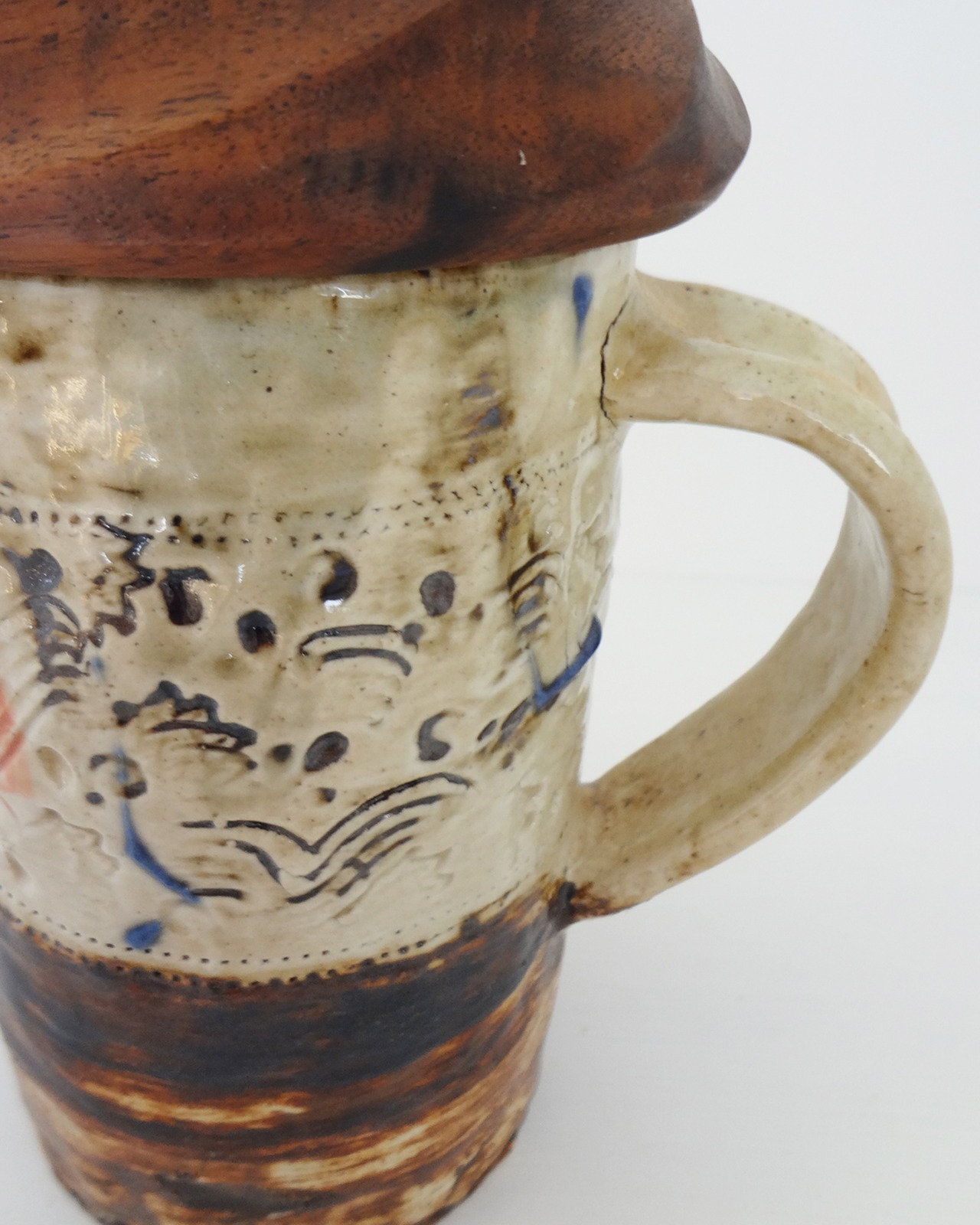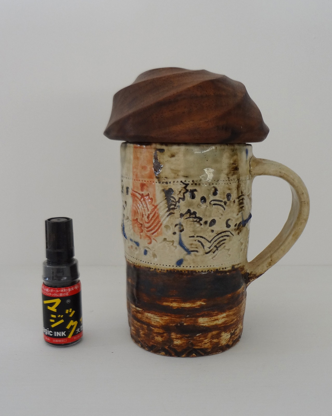 器の本体は、陶芸技法印華を用いて取っ手を付けてデザインしました。薄いベージュの地に紅と青を少し入れて、ベース部分は茶色に焼き上げました。