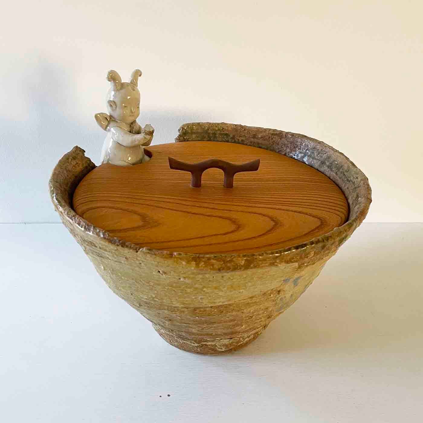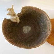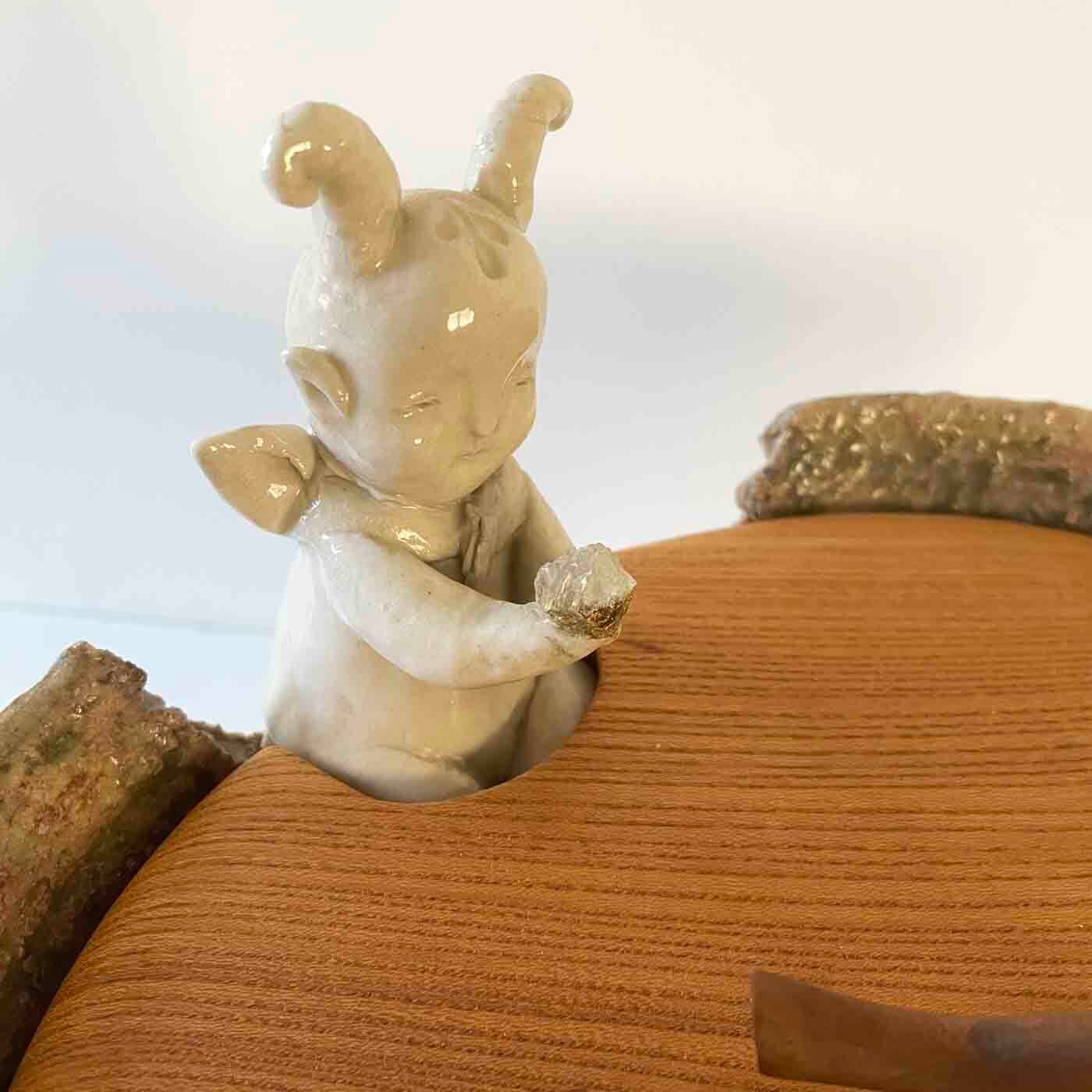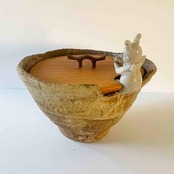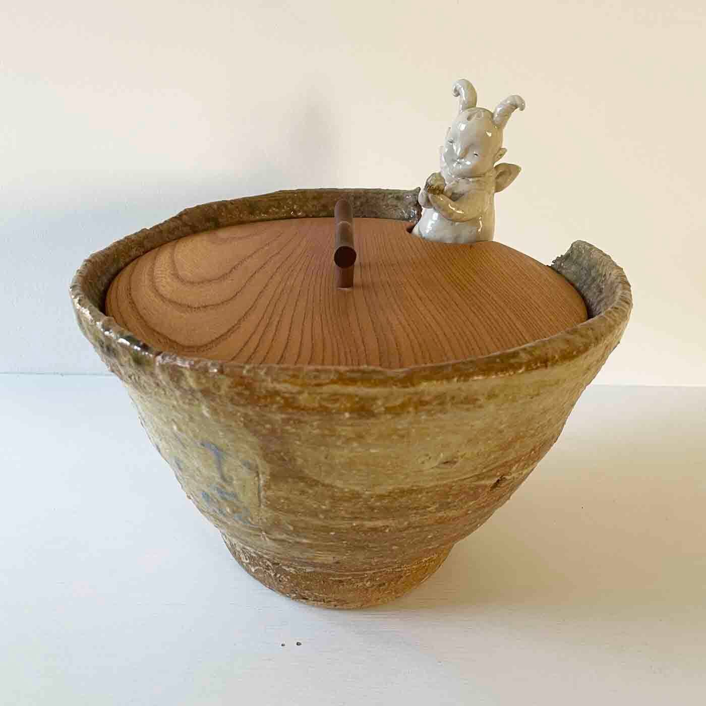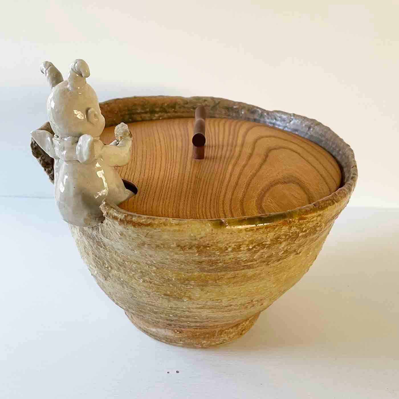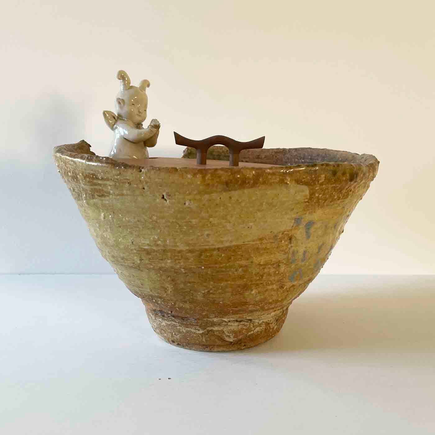 器本体は、信楽山土を精製して陶土にし、鉢型に造形。鉢の切れたところに吾偶鎮座。緑釉、灰釉を施して焼成。作品の物語は…そのヒトの想像力次第。。♪