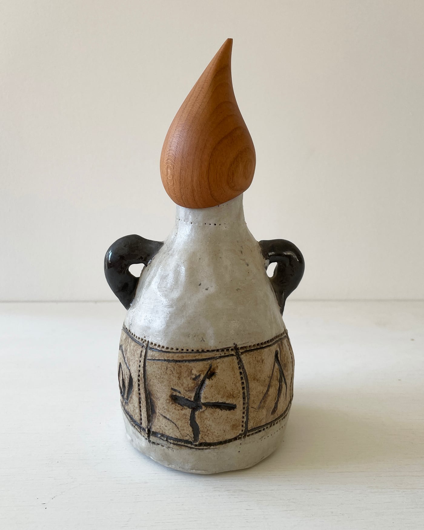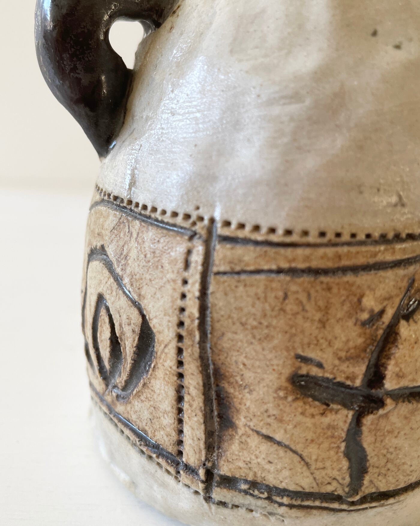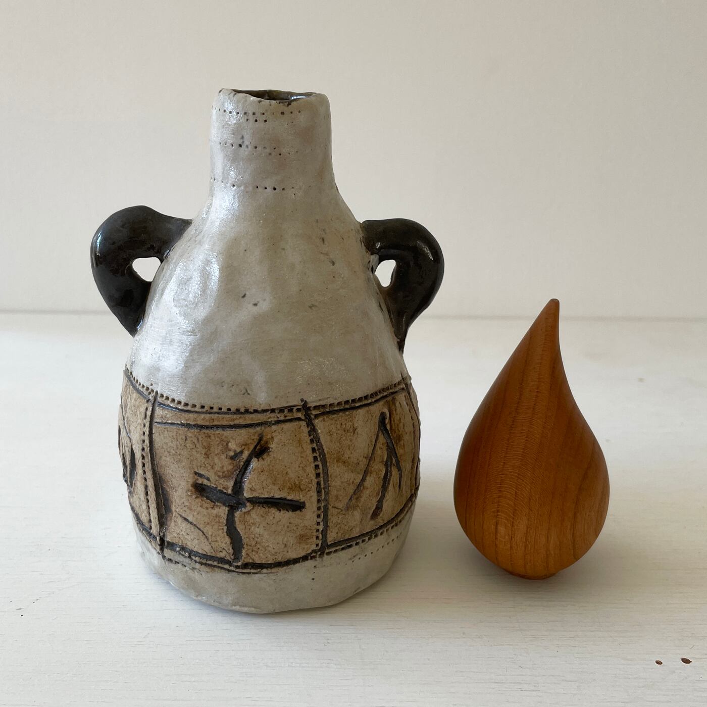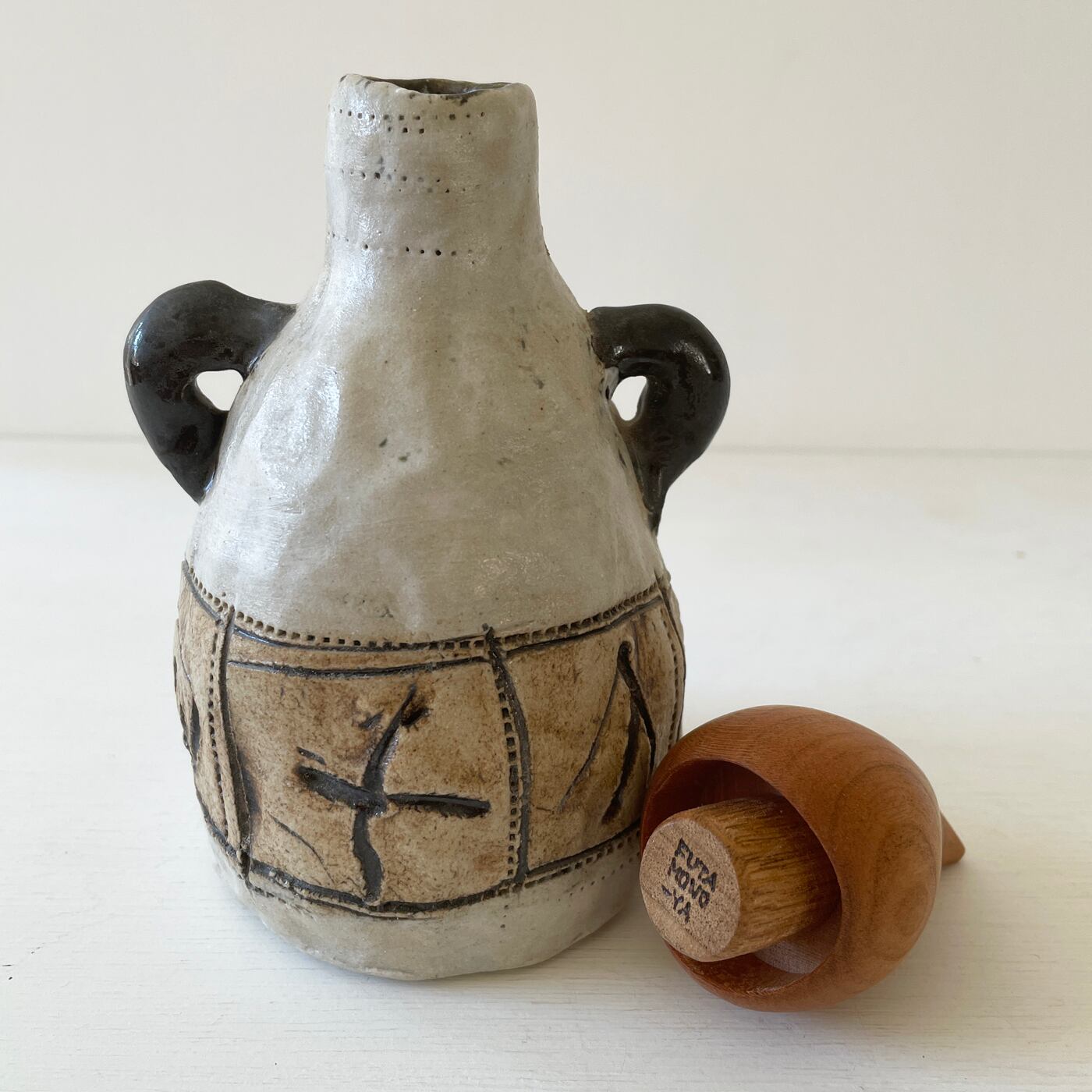 白地に引っ掻き紋様の本体に、二本の手がアクセント。