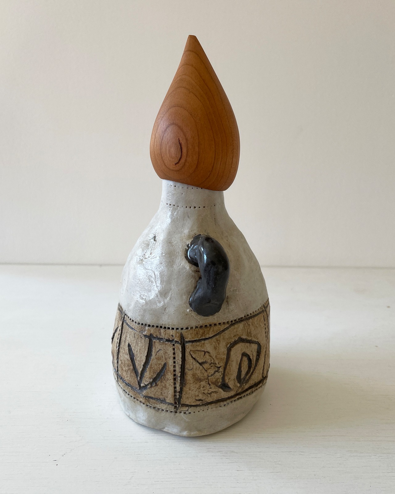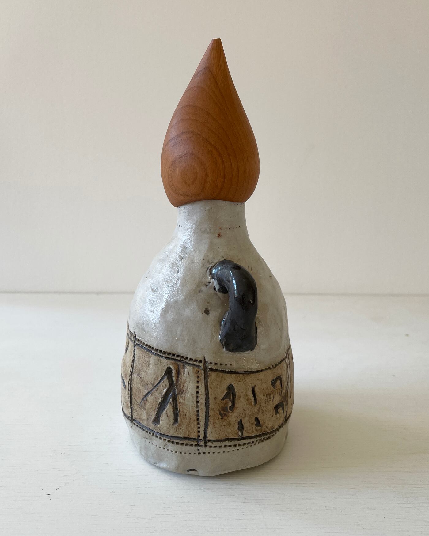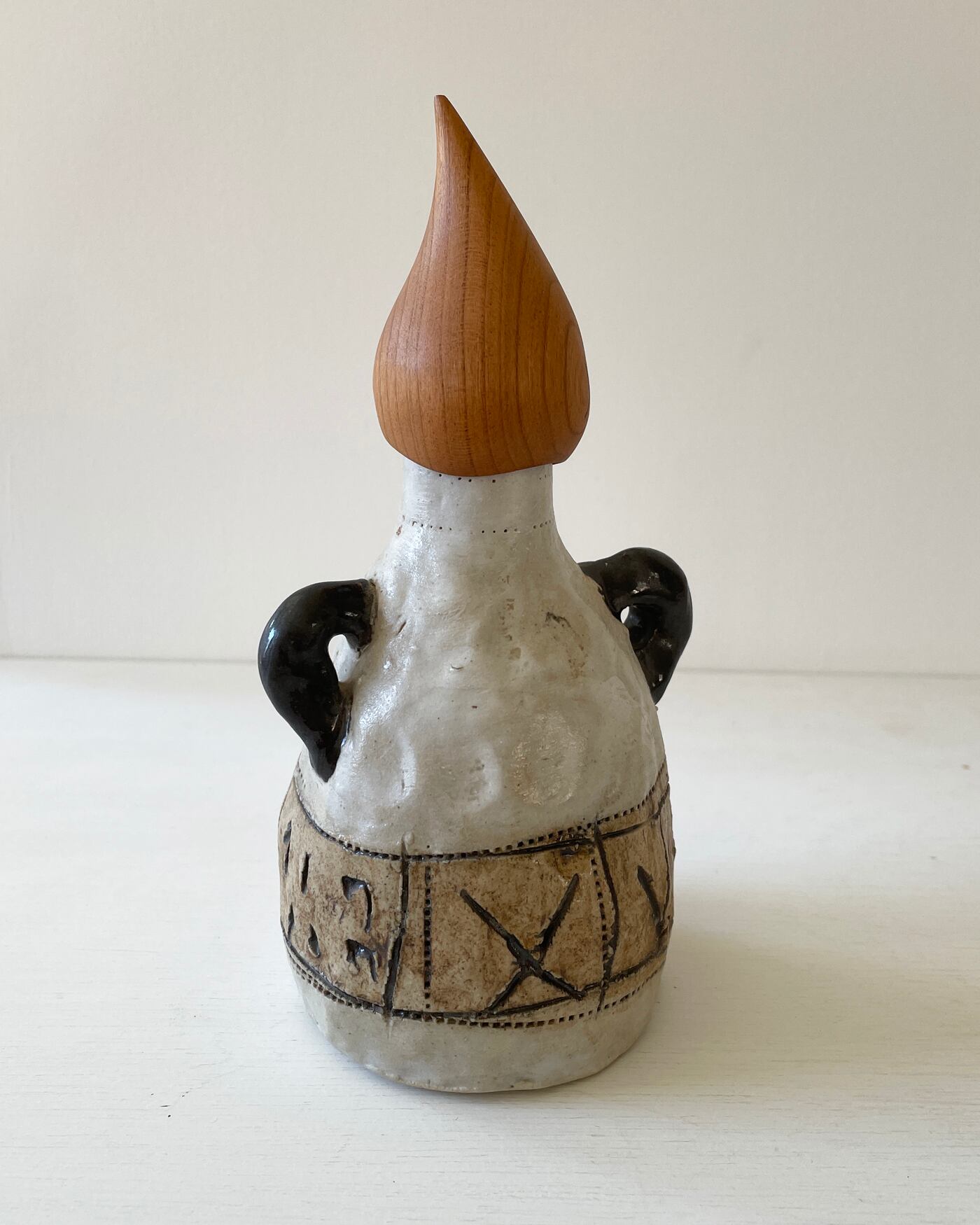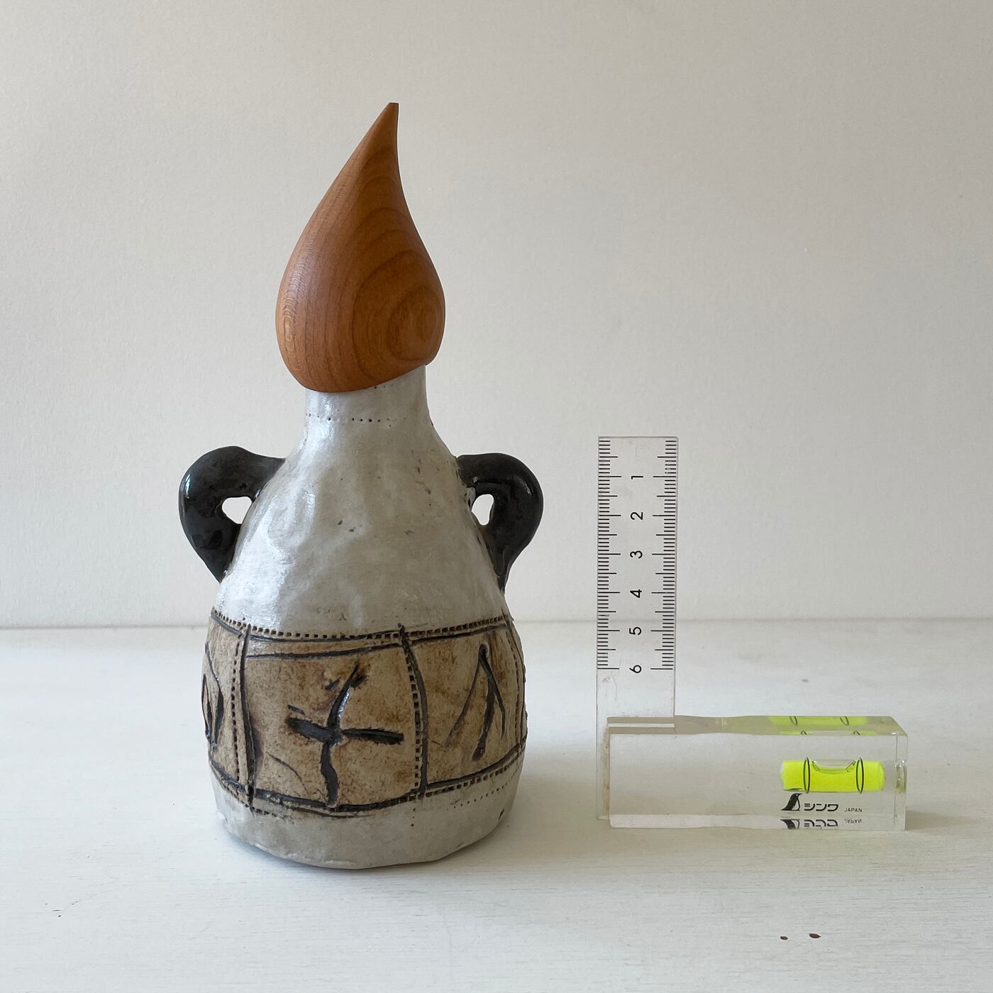 白地に引っ掻き紋様の本体に、二本の手がアクセント。