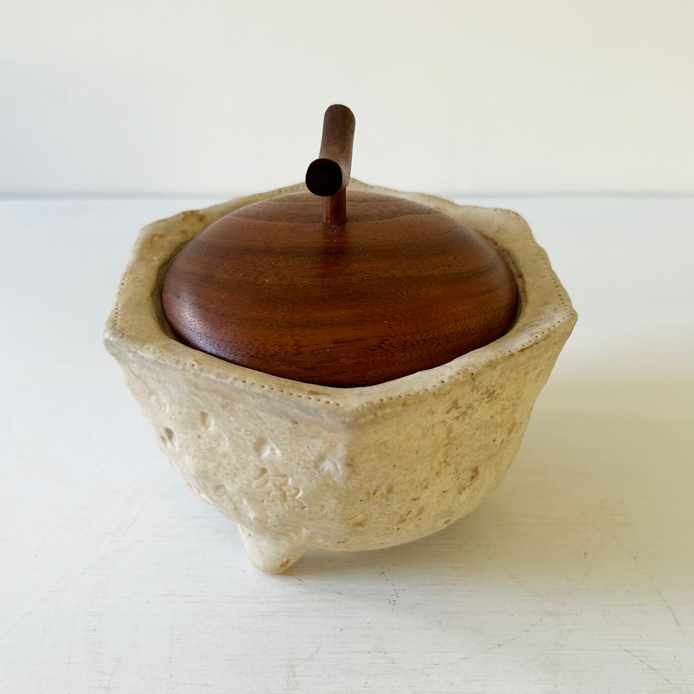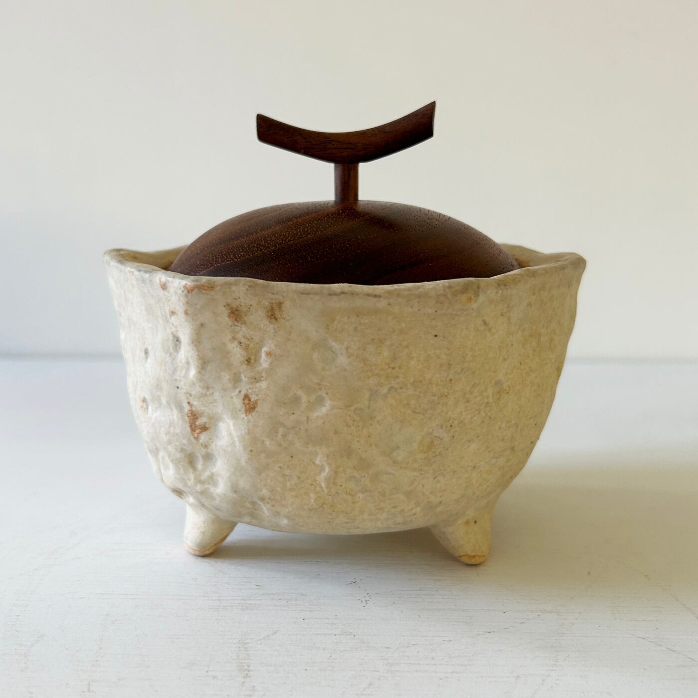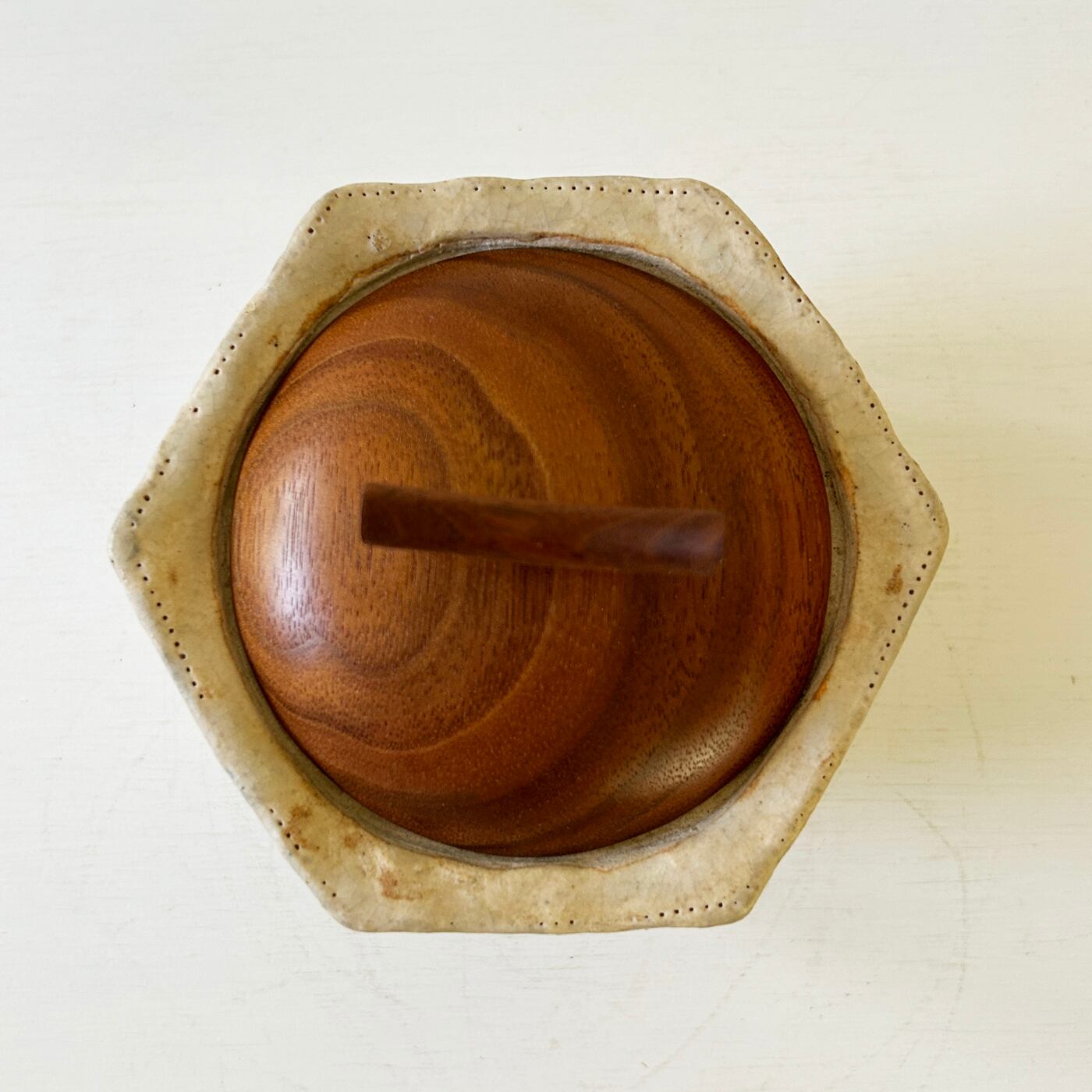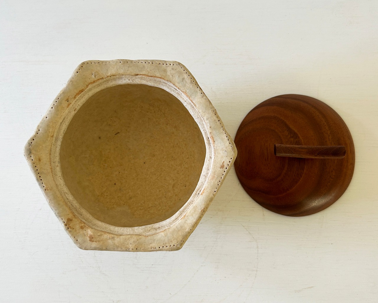 ふわりとしたフォルムの蓋に、小枝のようなつまみがかわいらしく乗っています。六角形の本体とのバランスが絶妙な作品です。
