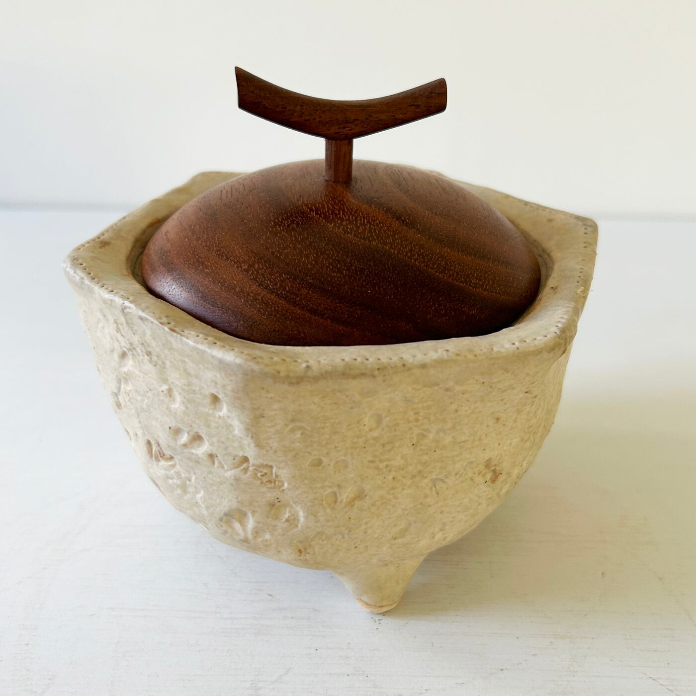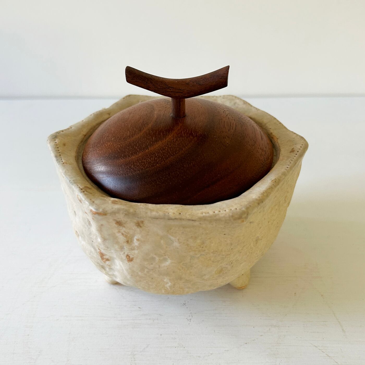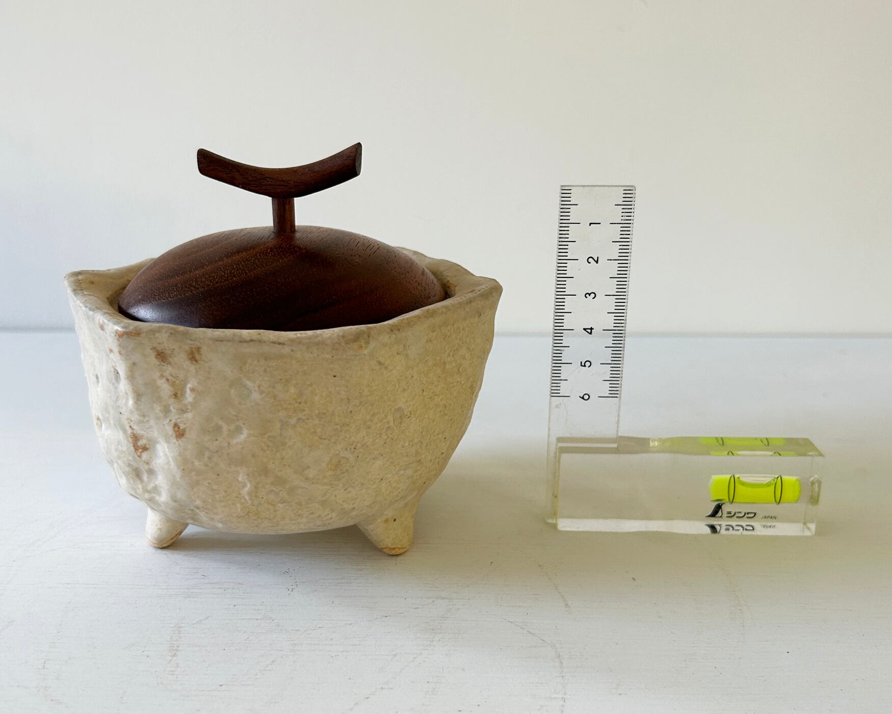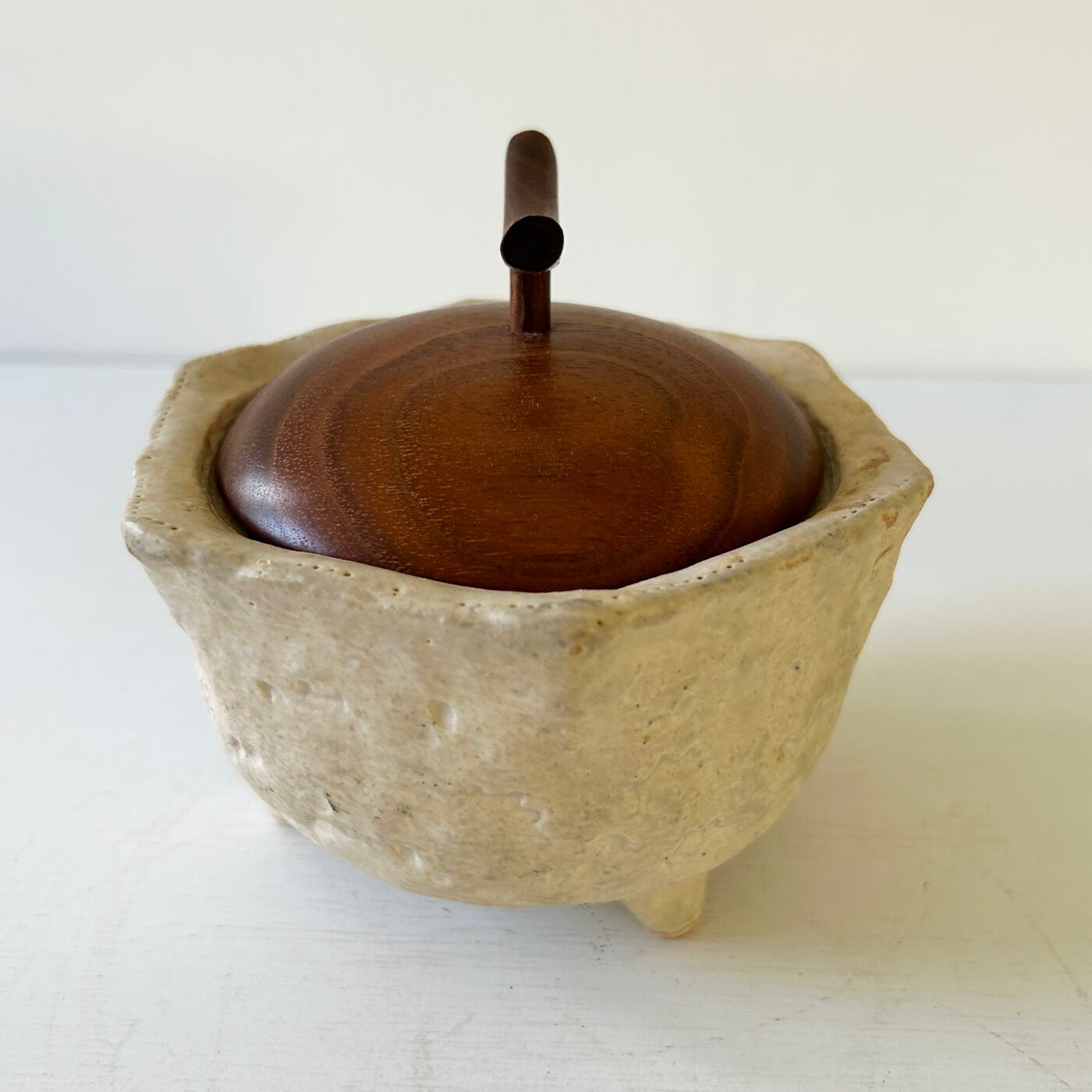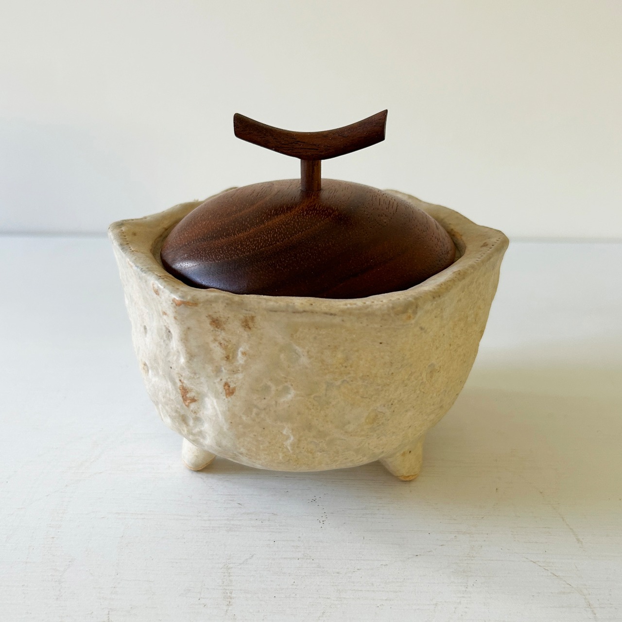 ふわりとしたフォルムの蓋に、小枝のようなつまみがかわいらしく乗っています。六角形の本体とのバランスが絶妙な作品です。