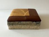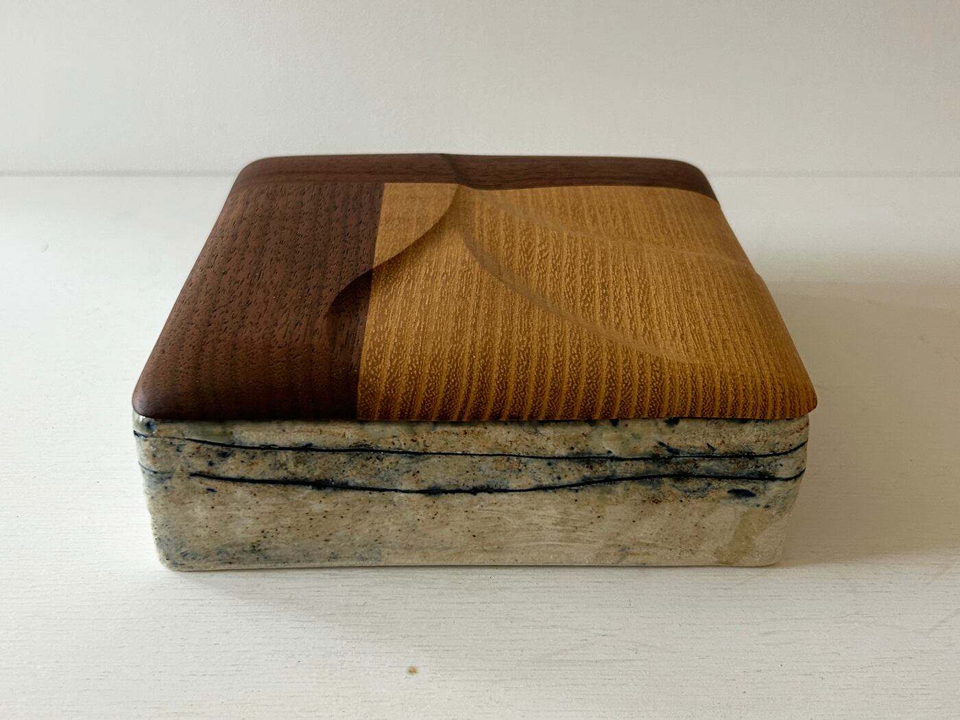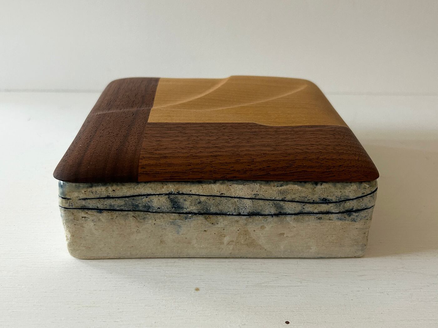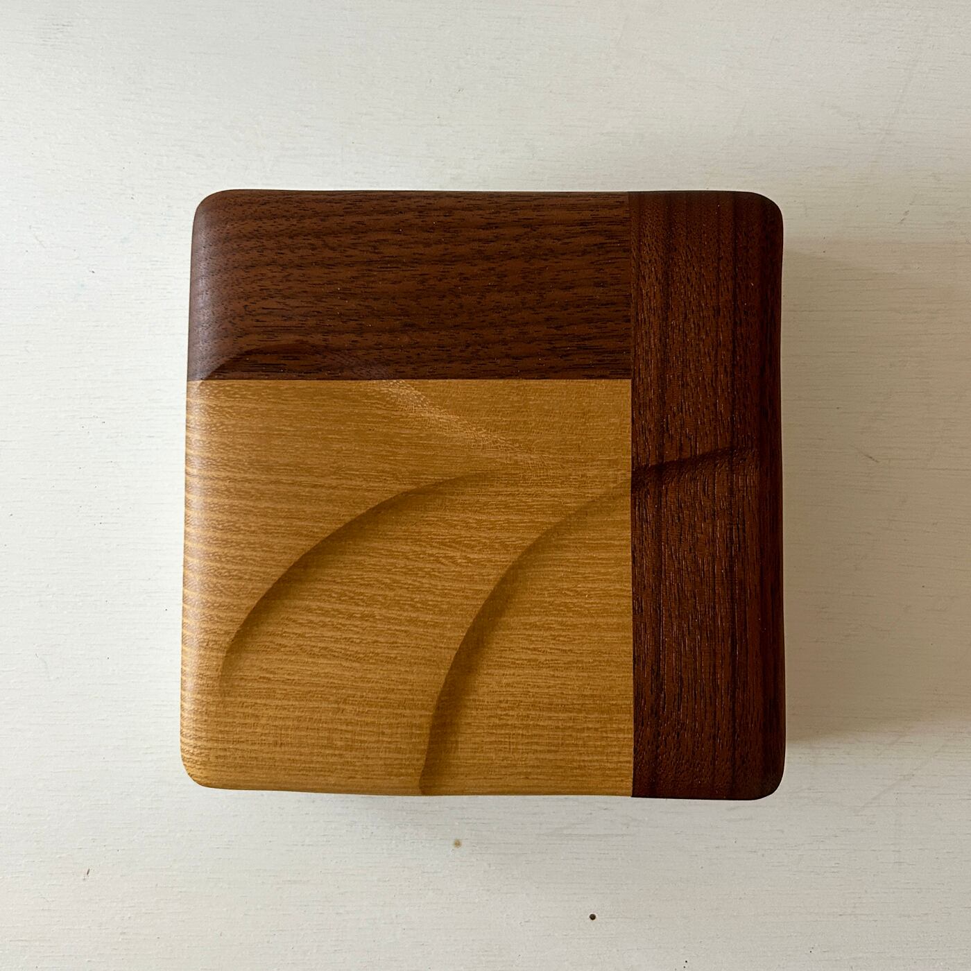合わせた蓋は、ニセアカシヤの明るい色と濃色のウォールナットのツートンカラーがコントラストになっています。表面に浅く模様も掘り込んでいて、表情に変化を与えています。